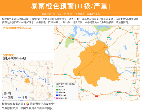 谷城县气象台2022年06月19日17时48分发布暴雨橙色预警信号:过去1小时,我县茨河镇雨量已接近40毫米,预计未来3小时茨河镇及周边乡镇仍有20-40毫米降水,伴有雷电,阵风7-9级,山区山洪、地质灾害、中小河流洪水气象风险较高,请注意防范。 信息来源:国家预警信息发布中心; 发布单位:谷城县气象台。