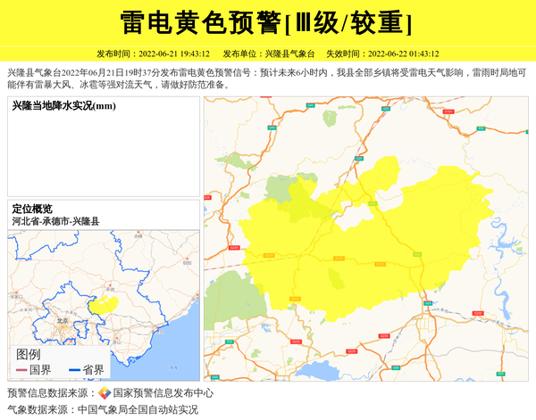 兴隆县气象台2022年06月21日19时37分发布雷电黄色预警信号:预计未来6小时内,我县全部乡镇将受雷电天气影响,雷雨时局地可能伴有雷暴大风、冰雹等强对流天气,请做好防范准备。 信息来源:国家预警信息发布中心; 发布单位:兴隆县气象台。