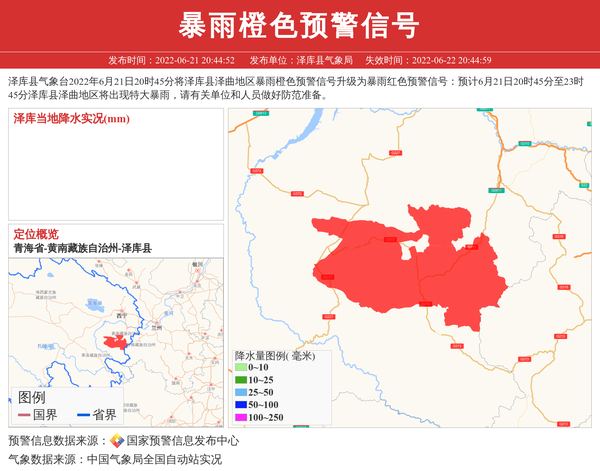 泽库县气象台2022年6月21日20时45分将泽库县泽曲地区暴雨橙色预警信号升级为暴雨红色预警信号:预计6月21日20时45分至23时45分泽库县泽曲地区将出现特大暴雨,请有关单位和人员做好防范准备。 信息来源:国家预警信息发布中心; 发布单位:泽库县气象局。