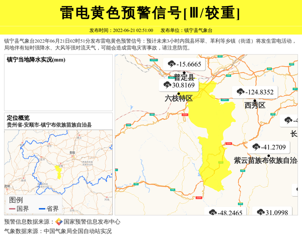 镇宁县气象台2022年06月21日02时51分发布雷电黄色预警信号:预计未来3小时内我县环翠、革利等乡镇(街道)将发生雷电活动,局地伴有短时强降水、大风等强对流天气,可能会造成雷电灾害事故,请注意防范。 信息来源:国家预警信息发布中心; 发布单位:镇宁县气象台。