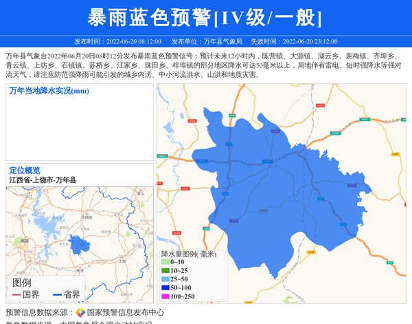 万年县气象台2022年06月20日08时12分发布暴雨蓝色预警信号:预计未来12小时内,陈营镇、大源镇、湖云乡、裴梅镇、齐埠乡、青云镇、上坊乡、石镇镇、苏桥乡、汪家乡、珠田乡、梓埠镇的部分地区降水可达50毫米以上,局地伴有雷电、短时强降水等强对流天气,请注意防范强降雨可能引发的城乡内涝、中小河流洪水、山洪和地质灾害。 信息来源:国家预警信息发布中心; 发布单位:万年县气象局。