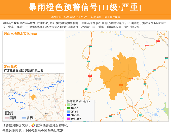 凤山县气象台2022年6月21日21时30分发布暴雨橙色预警信号:凤山县平乐乡平旺村已出现30毫米以上强降雨,预计未来3小时内平乐、中亭、凤城、三门海等乡镇仍将出现30-50毫米的强降水,易诱发山洪、滑坡、崩塌等灾害,请注意防范。 信息来源:国家预警信息发布中心; 发布单位:凤山县气象台。