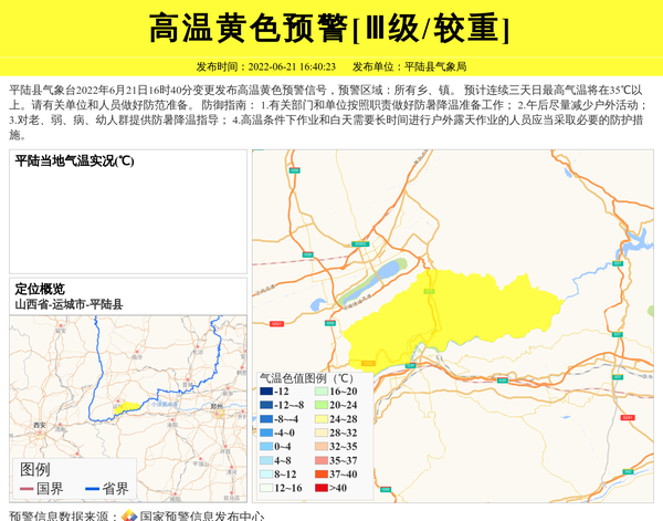 平陆县气象台2022年6月21日16时40分变更发布高温黄色预警信号,预警区域:所有乡、镇。 预计连续三天日最高气温将在35℃以上。请有关单位和人员做好防范准备。 防御指南: 1.有关部门和单位按照职责做好防暑降温准备工作; 2.午后尽量减少户外活动; 3.对老、弱、病、幼人群提供防暑降温指导; 4.高温条件下作业和白天需要长时间进行户外露天作业的人员应当采取必要的防护措施。 信息来源:国家预警信息发布中心; 发布单位:平陆县气象局。