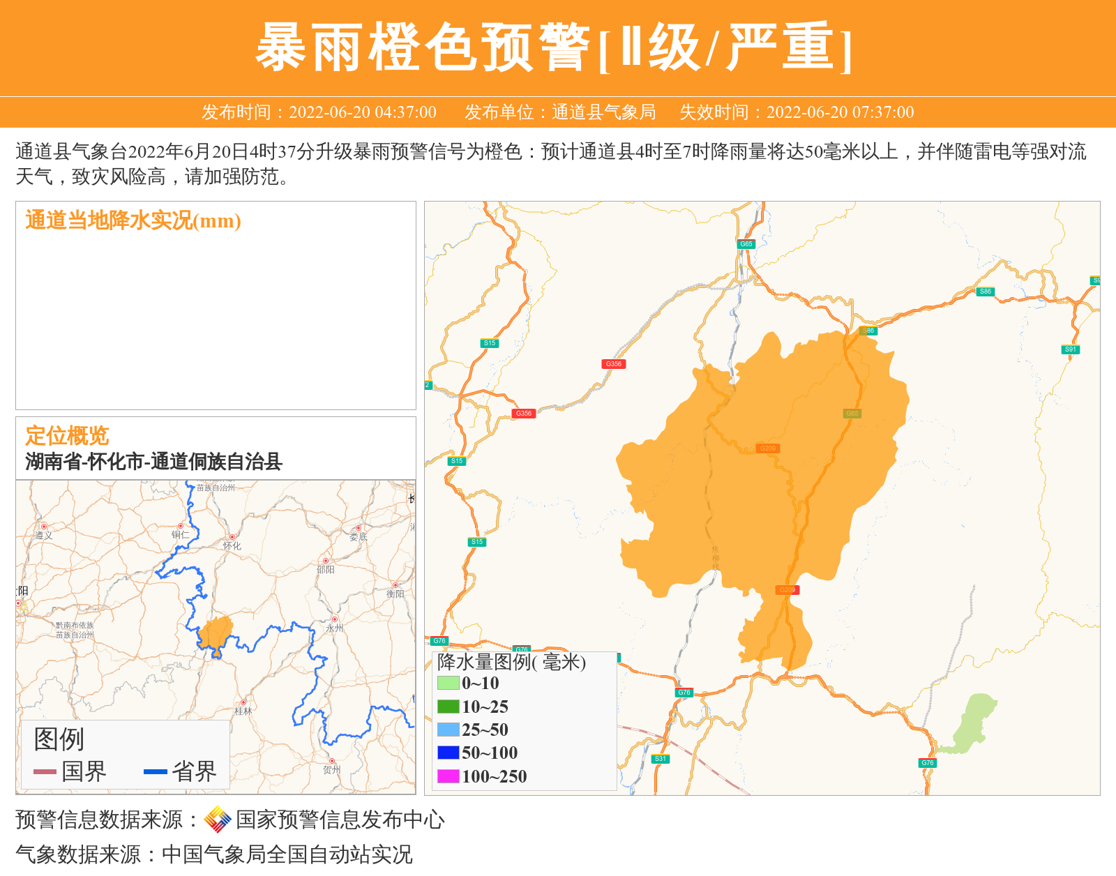 通道县气象台2022年6月20日4时37分升级暴雨预警信号为橙色:预计通道县4时至7时降雨量将达50毫米以上,并伴随雷电等强对流天气,致灾风险高,请加强防范。 信息来源:国家预警信息发布中心; 发布单位:通道县气象局。