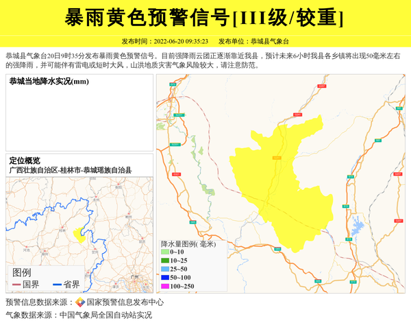 恭城县气象台20日9时35分发布暴雨黄色预警信号。目前强降雨云团正逐渐靠近我县,预计未来6小时我县各乡镇将出现50毫米左右的强降雨,并可能伴有雷电或短时大风,山洪地质灾害气象风险较大,请注意防范。 信息来源:国家预警信息发布中心; 发布单位:恭城县气象台。