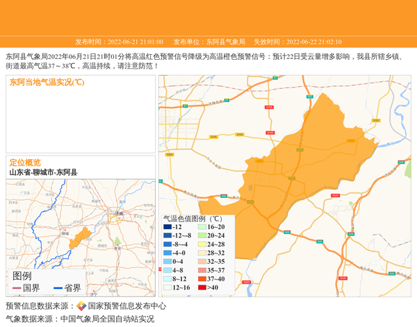 东阿县气象局2022年06月21日21时01分将高温红色预警信号降级为高温橙色预警信号:预计22日受云量增多影响,我县所辖乡镇、街道最高气温37~38℃,高温持续,请注意防范! 信息来源:国家预警信息发布中心; 发布单位:东阿县气象局。