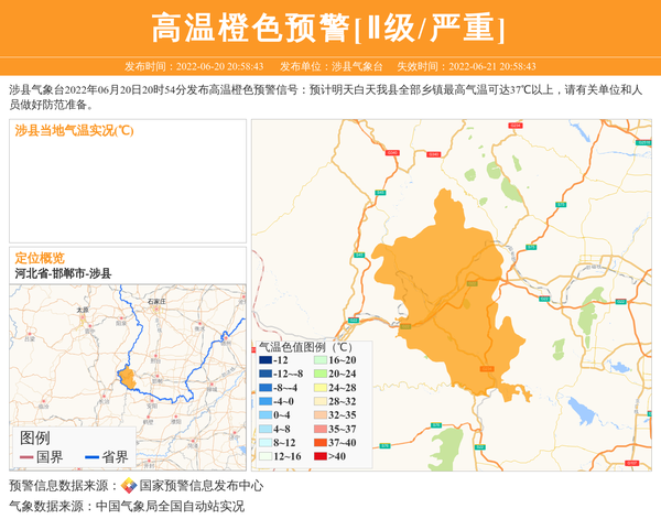 涉县气象台2022年06月20日20时54分发布高温橙色预警信号:预计明天白天我县全部乡镇最高气温可达37℃以上,请有关单位和人员做好防范准备。 信息来源:国家预警信息发布中心; 发布单位:涉县气象台。