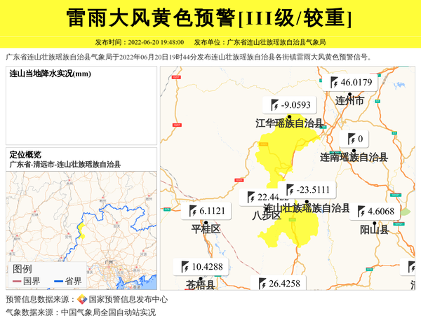 广东省连山壮族瑶族自治县气象局于2022年06月20日19时44分发布连山壮族瑶族自治县各街镇雷雨大风黄色预警信号。 信息来源:国家预警信息发布中心; 发布单位:广东省连山壮族瑶族自治县气象局。