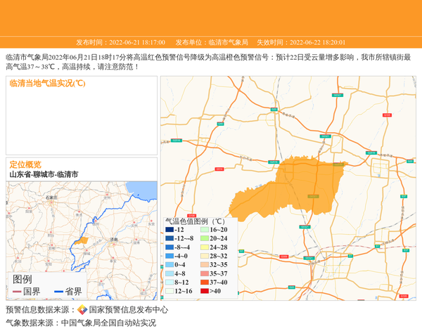临清市气象局2022年06月21日18时17分将高温红色预警信号降级为高温橙色预警信号:预计22日受云量增多影响,我市所辖镇街最高气温37~38℃,高温持续,请注意防范! 信息来源:国家预警信息发布中心; 发布单位:临清市气象局。