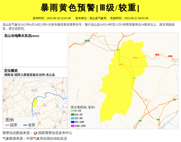 龙山县气象台2022年6月20日22时1分发布暴雨黄色预警信号:预计龙山县20日19时至21日1时降雨量将达50毫米以上,致灾风险较高,请注意防范。 信息来源:国家预警信息发布中心; 发布单位:龙山县气象局。