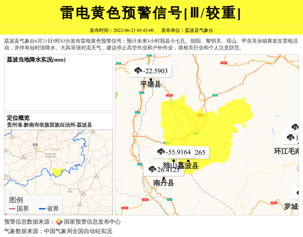 荔波县气象台6月21日5时43分发布雷电黄色预警信号:预计未来3小时我县小七孔、朝阳、黎明关、瑶山、甲良等乡镇将发生雷电活动,并伴有短时强降水、大风等强对流天气,建议停止高空作业和户外作业,请相关行业和个人注意防范。 信息来源:国家预警信息发布中心; 发布单位:荔波县气象台。