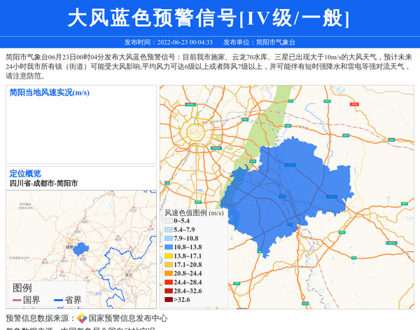 简阳市气象台06月23日00时04分发布大风蓝色预警信号:目前我市施家、云龙70水库、三星已出现大于10m/s的大风天气,预计未来24小时我市所有镇(街道)可能受大风影响,平均风力可达6级以上或者阵风7级以上,并可能伴有短时强降水和雷电等强对流天气,请注意防范。 信息来源:国家预警信息发布中心; 发布单位:简阳市气象台。