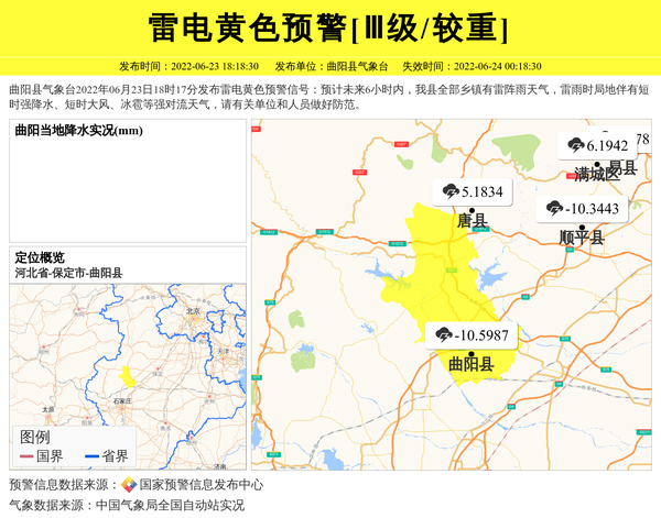 曲阳县气象台2022年06月23日18时17分发布雷电黄色预警信号:预计未来6小时内,我县全部乡镇有雷阵雨天气,雷雨时局地伴有短时强降水、短时大风、冰雹等强对流天气,请有关单位和人员做好防范。 信息来源:国家预警信息发布中心; 发布单位:曲阳县气象台。