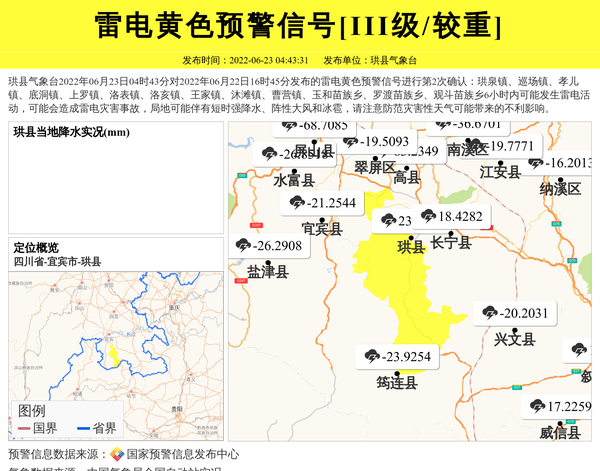 珙县气象台2022年06月23日04时43分对2022年06月22日16时45分发布的雷电黄色预警信号进行第2次确认:珙泉镇、巡场镇、孝儿镇、底洞镇、上罗镇、洛表镇、洛亥镇、王家镇、沐滩镇、曹营镇、玉和苗族乡、罗渡苗族乡、观斗苗族乡6小时内可能发生雷电活动,可能会造成雷电灾害事故,局地可能伴有短时强降水、阵性大风和冰雹,请注意防范灾害性天气可能带来的不利影响。 信息来源:国家预警信息发布中心; 发布单位:珙县气象台。