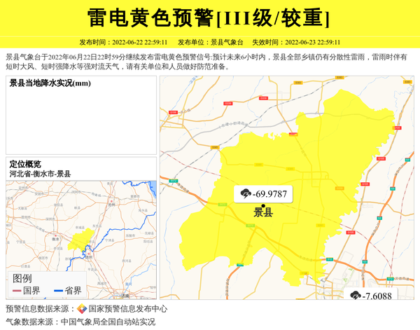 景县气象台于2022年06月22日22时59分继续发布雷电黄色预警信号:预计未来6小时内,景县全部乡镇仍有分散性雷雨,雷雨时伴有短时大风、短时强降水等强对流天气,请有关单位和人员做好防范准备。 信息来源:国家预警信息发布中心; 发布单位:景县气象台。