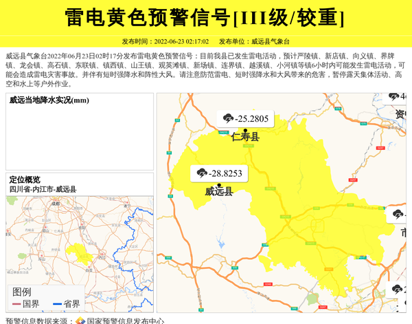 威远县气象台2022年06月23日02时17分发布雷电黄色预警信号:目前我县已发生雷电活动,预计严陵镇、新店镇、向义镇、界牌镇、龙会镇、高石镇、东联镇、镇西镇、山王镇、观英滩镇、新场镇、连界镇、越溪镇、小河镇等镇6小时内可能发生雷电活动,可能会造成雷电灾害事故。并伴有短时强降水和阵性大风。请注意防范雷电、短时强降水和大风带来的危害,暂停露天集体活动、高空和水上等户外作业。 信息来源:国家预警信息发布中心; 发布单位:威远县气象台。