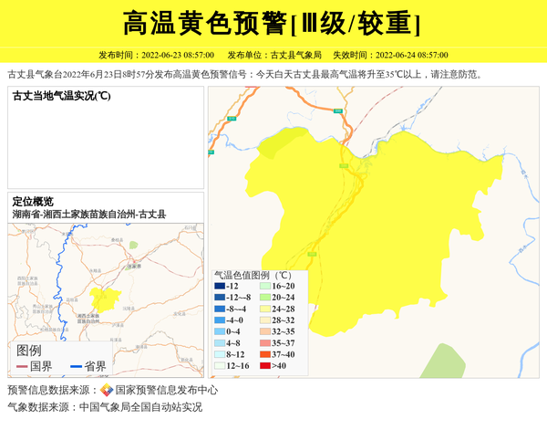 古丈县气象台2022年6月23日8时57分发布高温黄色预警信号:今天白天古丈县最高气温将升至35℃以上,请注意防范。 信息来源:国家预警信息发布中心; 发布单位:古丈县气象局。