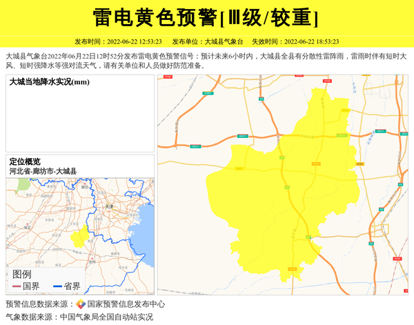 大城县气象台2022年06月22日12时52分发布雷电黄色预警信号:预计未来6小时内,大城县全县有分散性雷阵雨,雷雨时伴有短时大风、短时强降水等强对流天气,请有关单位和人员做好防范准备。 信息来源:国家预警信息发布中心; 发布单位:大城县气象台。
