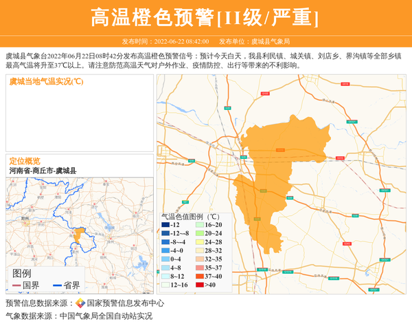 虞城县气象台2022年06月22日08时42分发布高温橙色预警信号:预计今天白天,我县利民镇、城关镇、刘店乡、界沟镇等全部乡镇最高气温将升至37℃以上。请注意防范高温天气对户外作业、疫情防控、出行等带来的不利影响。 信息来源:国家预警信息发布中心; 发布单位:虞城县气象局。