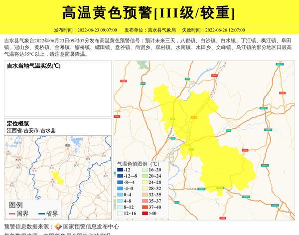 吉水县气象台2022年06月23日09时07分发布高温黄色预警信号:预计未来三天,八都镇、白沙镇、白水镇、丁江镇、枫江镇、阜田镇、冠山乡、黄桥镇、金滩镇、醪桥镇、螺田镇、盘谷镇、尚贤乡、双村镇、水南镇、水田乡、文峰镇、乌江镇的部分地区日最高气温将达35°C以上,请注意防暑降温。 信息来源:国家预警信息发布中心; 发布单位:吉水县气象局。