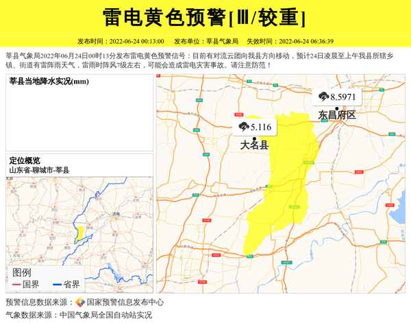 莘县气象局2022年06月24日00时13分发布雷电黄色预警信号:目前有对流云团向我县方向移动,预计24日凌晨至上午我县所辖乡镇、街道有雷阵雨天气,雷雨时阵风7级左右,可能会造成雷电灾害事故。请注意防范! 信息来源:国家预警信息发布中心; 发布单位:莘县气象局。