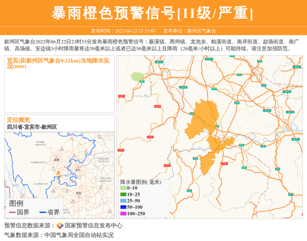 叙州区气象台2022年06月22日23时53分发布暴雨橙色预警信号:蕨溪镇、商州镇、龙池乡、柏溪街道、南岸街道、赵场街道、南广镇、高场镇、安边镇3小时降雨量将达50毫米以上或者已达50毫米以上且降雨(20毫米/小时以上)可能持续。请注意加强防范。 信息来源:国家预警信息发布中心; 发布单位:叙州区气象台。