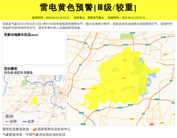 安新县气象台2022年06月23日16时53分发布雷电黄色预警信号:预计未来两小时内,安新县全部乡镇将出现雷阵雨天气,雷雨时伴有短时大风等强对流天气,请有关单位和人员做好防范准备。 信息来源:国家预警信息发布中心; 发布单位:安新县气象台。