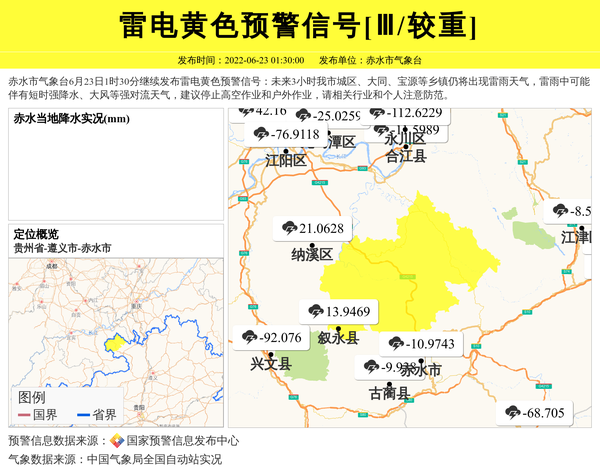 赤水市气象台6月23日1时30分继续发布雷电黄色预警信号:未来3小时我市城区、大同、宝源等乡镇仍将出现雷雨天气,雷雨中可能伴有短时强降水、大风等强对流天气,建议停止高空作业和户外作业,请相关行业和个人注意防范。 信息来源:国家预警信息发布中心; 发布单位:赤水市气象台。