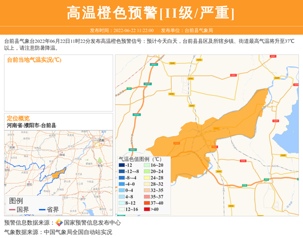 台前县气象台2022年06月22日11时22分发布高温橙色预警信号:预计今天白天,台前县县区及所辖乡镇、街道最高气温将升至37℃以上,请注意防暑降温。 信息来源:国家预警信息发布中心; 发布单位:台前县气象局。