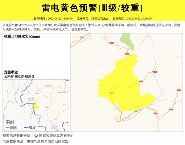 镇康县气象台2022年6月22日14时20分发布雷电黄色预警信号:预计未来6小时我县南伞镇、勐捧镇、木场乡将出现雷电活动,局地可能伴有短时强降水、大风、冰雹等强对流天气,请注意防范。 信息来源:国家预警信息发布中心; 发布单位:镇康县气象台。