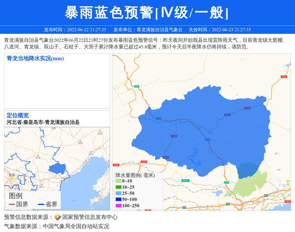 青龙满族自治县气象台2022年06月22日21时27分发布暴雨蓝色预警信号:昨天夜间开始我县出现雷阵雨天气,目前青龙镇大窝棚、八道河、青龙镇、双山子、石杖子、大营子累计降水量已超过45.8毫米,预计今天后半夜降水仍将持续,请防范。 信息来源:国家预警信息发布中心; 发布单位:青龙满族自治县气象台。