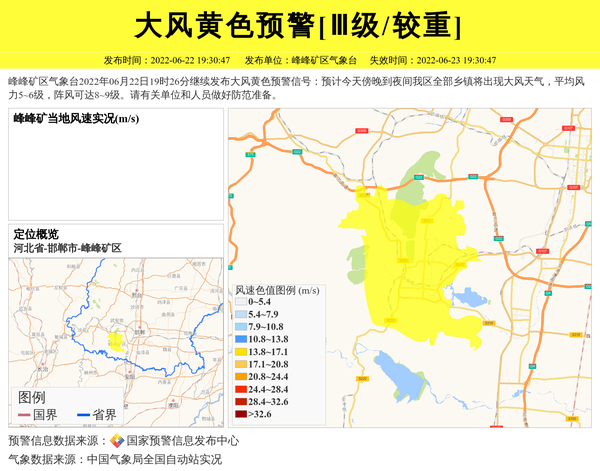 峰峰矿区气象台2022年06月22日19时26分继续发布大风黄色预警信号:预计今天傍晚到夜间我区全部乡镇将出现大风天气,平均风力5~6级,阵风可达8~9级。请有关单位和人员做好防范准备。 信息来源:国家预警信息发布中心; 发布单位:峰峰矿区气象台。