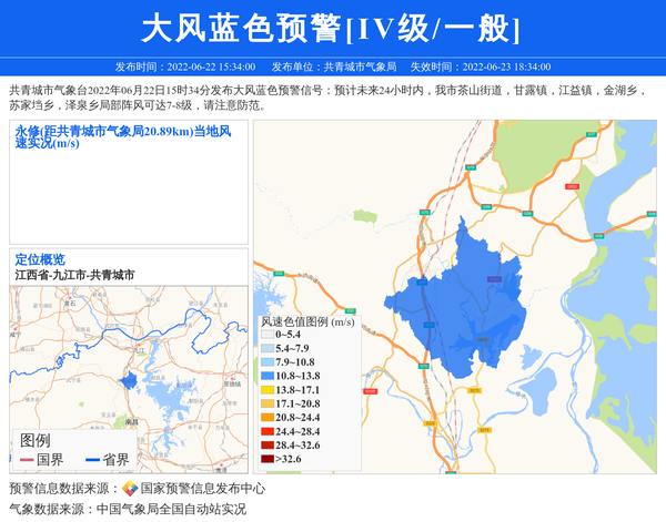 共青城市气象台2022年06月22日15时34分发布大风蓝色预警信号:预计未来24小时内,我市茶山街道,甘露镇,江益镇,金湖乡,苏家垱乡,泽泉乡局部阵风可达7-8级,请注意防范。 信息来源:国家预警信息发布中心; 发布单位:共青城市气象局。