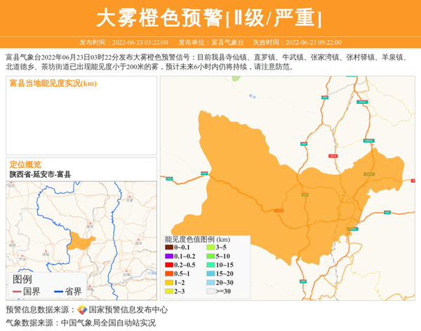 富县气象台2022年06月23日03时22分发布大雾橙色预警信号:目前我县寺仙镇、直罗镇、牛武镇、张家湾镇、张村驿镇、羊泉镇、北道德乡、茶坊街道已出现能见度小于200米的雾,预计未来6小时内仍将持续,请注意防范。 信息来源:国家预警信息发布中心; 发布单位:富县气象台。