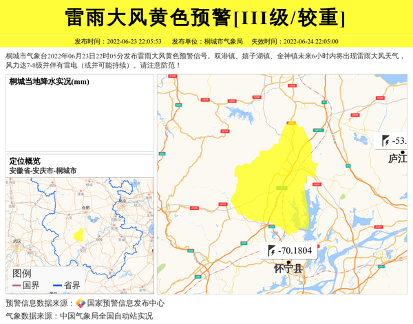 桐城市气象台2022年06月23日22时05分发布雷雨大风黄色预警信号。双港镇、嬉子湖镇、金神镇未来6小时内将出现雷雨大风天气,风力达7-8级并伴有雷电(或并可能持续)。请注意防范! 信息来源:国家预警信息发布中心; 发布单位:桐城市气象局。