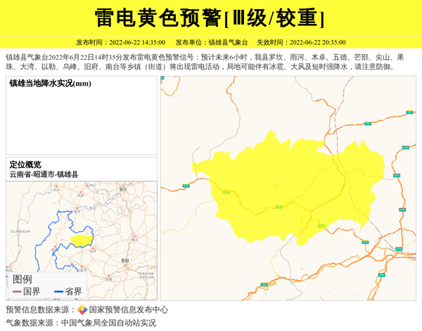 镇雄县气象台2022年6月22日14时35分发布雷电黄色预警信号:预计未来6小时,我县罗坎、雨河、木卓、五德、芒部、尖山、果珠、大湾、以勒、乌峰、旧府、南台等乡镇(街道)将出现雷电活动,局地可能伴有冰雹、大风及短时强降水,请注意防御。 信息来源:国家预警信息发布中心; 发布单位:镇雄县气象台。
