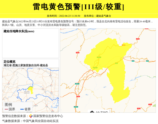 建始县气象台2022年06月23日11时35分发布雷电黄色预警信号:预计未来6小时,我县自北向南有雷电活动发生,雨量20-40毫米,阵风5-7级。山洪、地质灾害、中小河流洪水风险等级较高,请注意防范。 信息来源:国家预警信息发布中心; 发布单位:建始县气象台。