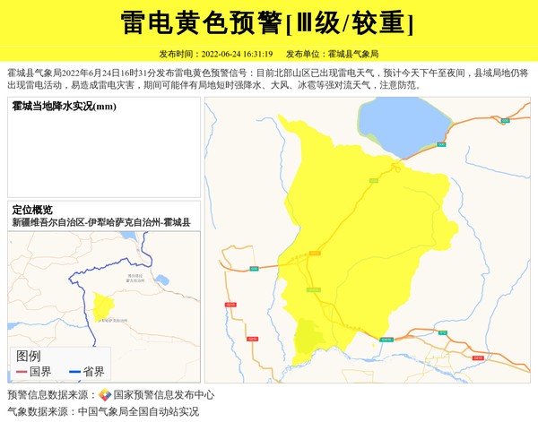 霍城县气象局2022年6月24日16时31分发布雷电黄色预警信号:目前北部山区已出现雷电天气,预计今天下午至夜间,县域局地仍将出现雷电活动,易造成雷电灾害,期间可能伴有局地短时强降水、大风、冰雹等强对流天气,注意防范。 信息来源:国家预警信息发布中心; 发布单位:霍城县气象局。