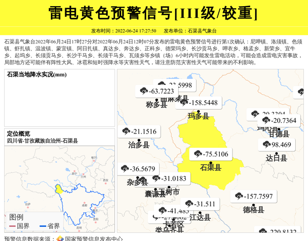 石渠县气象台2022年06月24日17时27分对2022年06月24日12时07分发布的雷电黄色预警信号进行第1次确认:尼呷镇、洛须镇、色须镇、虾扎镇、温波镇、蒙宜镇、阿日扎镇、真达乡、奔达乡、正科乡、德荣玛乡、长沙贡马乡、呷衣乡、格孟乡、新荣乡、宜牛乡、起坞乡、长须贡马乡、长沙干马乡、长须干马乡、瓦须乡等乡镇(场)6小时内可能发生雷电活动,可能会造成雷电灾害事故,局部地方还可能伴有阵性大风、冰雹和短时强降水等灾害性天气,请注意防范灾害性天气可能带来的不利影响。 信息来源:国家预警信息发布中心; 发布单位:石渠县气象台。