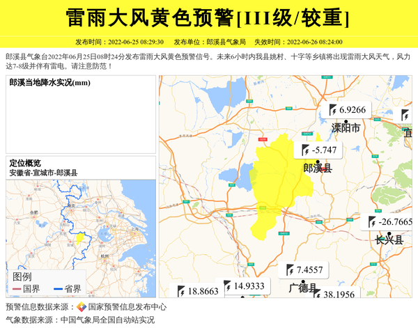 郎溪县气象台2022年06月25日08时24分发布雷雨大风黄色预警信号。未来6小时内我县姚村、十字等乡镇将出现雷雨大风天气,风力达7-8级并伴有雷电。请注意防范! 信息来源:国家预警信息发布中心; 发布单位:郎溪县气象局。