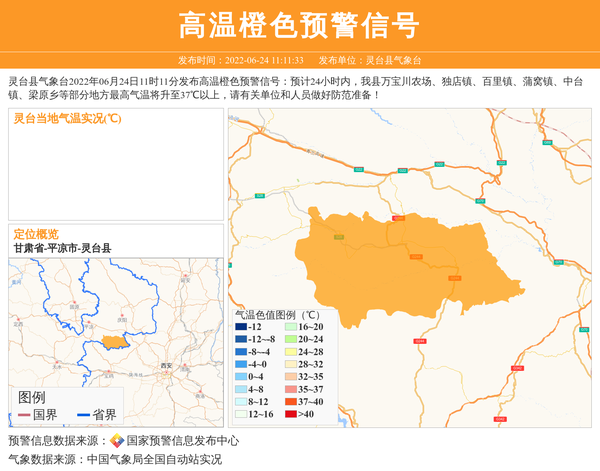 灵台县气象台2022年06月24日11时11分发布高温橙色预警信号:预计24小时内,我县万宝川农场、独店镇、百里镇、蒲窝镇、中台镇、梁原乡等部分地方最高气温将升至37℃以上,请有关单位和人员做好防范准备! 信息来源:国家预警信息发布中心; 发布单位:灵台县气象台。