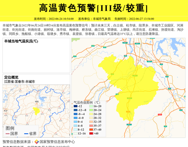 丰城市气象台2022年06月24日10时54分发布高温黄色预警信号:预计未来三天,白土镇、杜市镇、段潭乡、丰城市工业园区、河洲街道、剑光街道、剑南街道、丽村镇、洛市镇、梅林镇、桥东镇、曲江镇、荣塘镇、上塘镇、尚庄街道、石滩镇、孙渡街道、淘沙镇、同田乡、拖船镇、小港镇、筱塘乡、秀市镇、袁渡镇、张巷镇,日最高气温将达35°C以上,请注意防暑降温。 信息来源:国家预警信息发布中心; 发布单位:丰城市气象局。