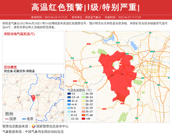 井陉县气象台2022年06月24日17时14分继续发布高温红色预警信号:预计明天白天井陉县全部乡镇、井陉矿区全部乡镇最高气温可达40℃,请有关单位和人员做好防范准备。 信息来源:国家预警信息发布中心; 发布单位:井陉县气象台。