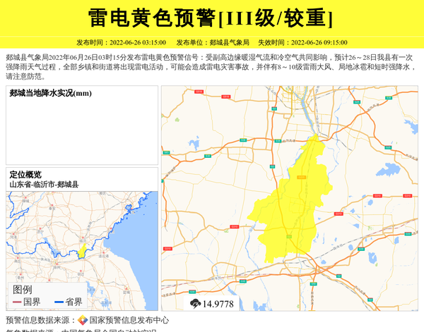 郯城县气象局2022年06月26日03时15分发布雷电黄色预警信号:受副高边缘暖湿气流和冷空气共同影响,预计26~28日我县有一次强降雨天气过程,全部乡镇和街道将出现雷电活动,可能会造成雷电灾害事故,并伴有8~10级雷雨大风、局地冰雹和短时强降水,请注意防范。 信息来源:国家预警信息发布中心; 发布单位:郯城县气象局。