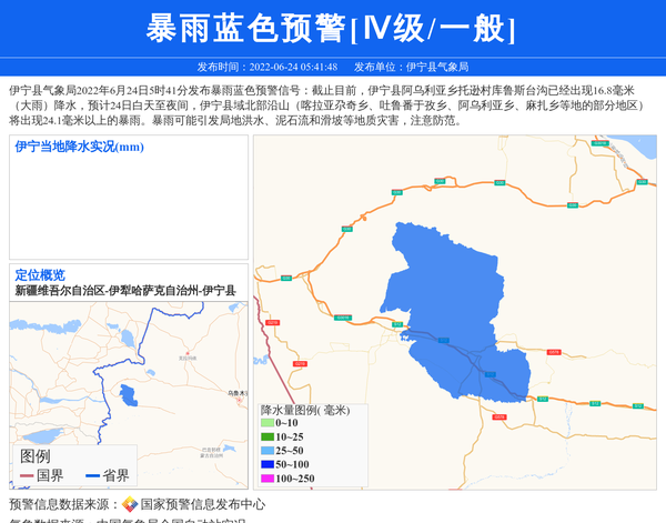 伊宁县气象局2022年6月24日5时41分发布暴雨蓝色预警信号:截止目前,伊宁县阿乌利亚乡托逊村库鲁斯台沟已经出现16.8毫米(大雨)降水,预计24日白天至夜间,伊宁县域北部沿山(喀拉亚尕奇乡、吐鲁番于孜乡、阿乌利亚乡、麻扎乡等地的部分地区)将出现24.1毫米以上的暴雨。暴雨可能引发局地洪水、泥石流和滑坡等地质灾害,注意防范。 信息来源:国家预警信息发布中心; 发布单位:伊宁县气象局。
