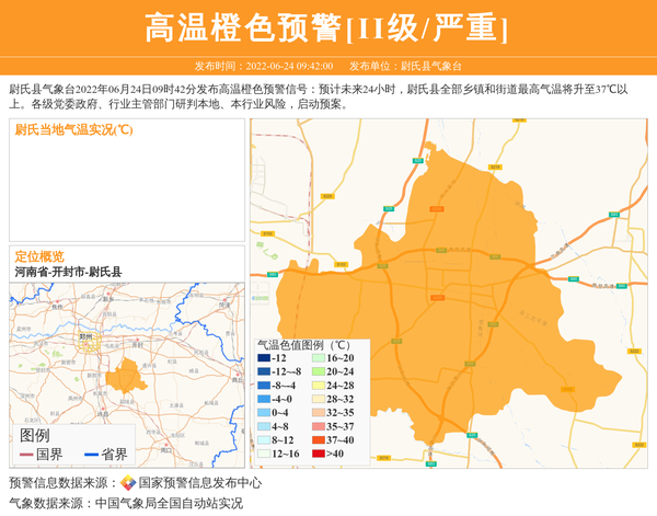 尉氏县气象台2022年06月24日09时42分发布高温橙色预警信号:预计未来24小时,尉氏县全部乡镇和街道最高气温将升至37℃以上。各级党委政府、行业主管部门研判本地、本行业风险,启动预案。 信息来源:国家预警信息发布中心; 发布单位:尉氏县气象台。