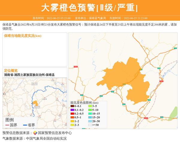 保靖县气象台2022年6月25日5时23分发布大雾橙色预警信号:预计保靖县24日下半夜至25日上午将出现能见度不足200米的雾,请加强防范。 信息来源:国家预警信息发布中心; 发布单位:保靖县气象局。