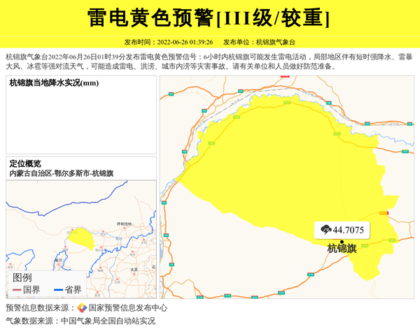 杭锦旗气象台2022年06月26日01时39分发布雷电黄色预警信号:6小时内杭锦旗可能发生雷电活动,局部地区伴有短时强降水、雷暴大风、冰雹等强对流天气,可能造成雷电、洪涝、城市内涝等灾害事故。请有关单位和人员做好防范准备。 信息来源:国家预警信息发布中心; 发布单位:杭锦旗气象台。