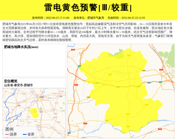 肥城市气象局2022年06月25日17时11分发布雷电黄色预警信号:受副高边缘暖湿气流和冷空气共同影响,26~28日我市迎来今年首次大范围暴雨过程,并伴有大风和明显雷电。强降雨主要在26日下午到27日上午,全市大部分乡镇、街道有暴雨,部分地区有大暴雨或特大暴雨。全市过程平均降水量80~130毫米,局部可达200毫米,最大小时降水量50~90毫米。此次天气过程影响范围广、降水量大、风力强,需加强防范中小河流洪水、山洪、滑坡、内涝及大风、雷电等灾害。由于当前天气形势复杂多变,气象部门将继续密切跟踪此次天气过程,及时发布精细化预报预警。 信息来源:国家预警信息发布中心; 发布单位:肥城市气象局。