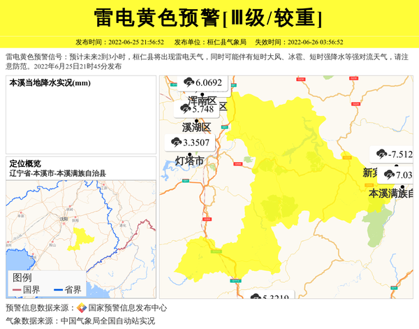 雷电黄色预警信号:预计未来2到3小时,桓仁县将出现雷电天气,同时可能伴有短时大风、冰雹、短时强降水等强对流天气,请注意防范。2022年6月25日21时45分发布 信息来源:国家预警信息发布中心; 发布单位:桓仁县气象局。